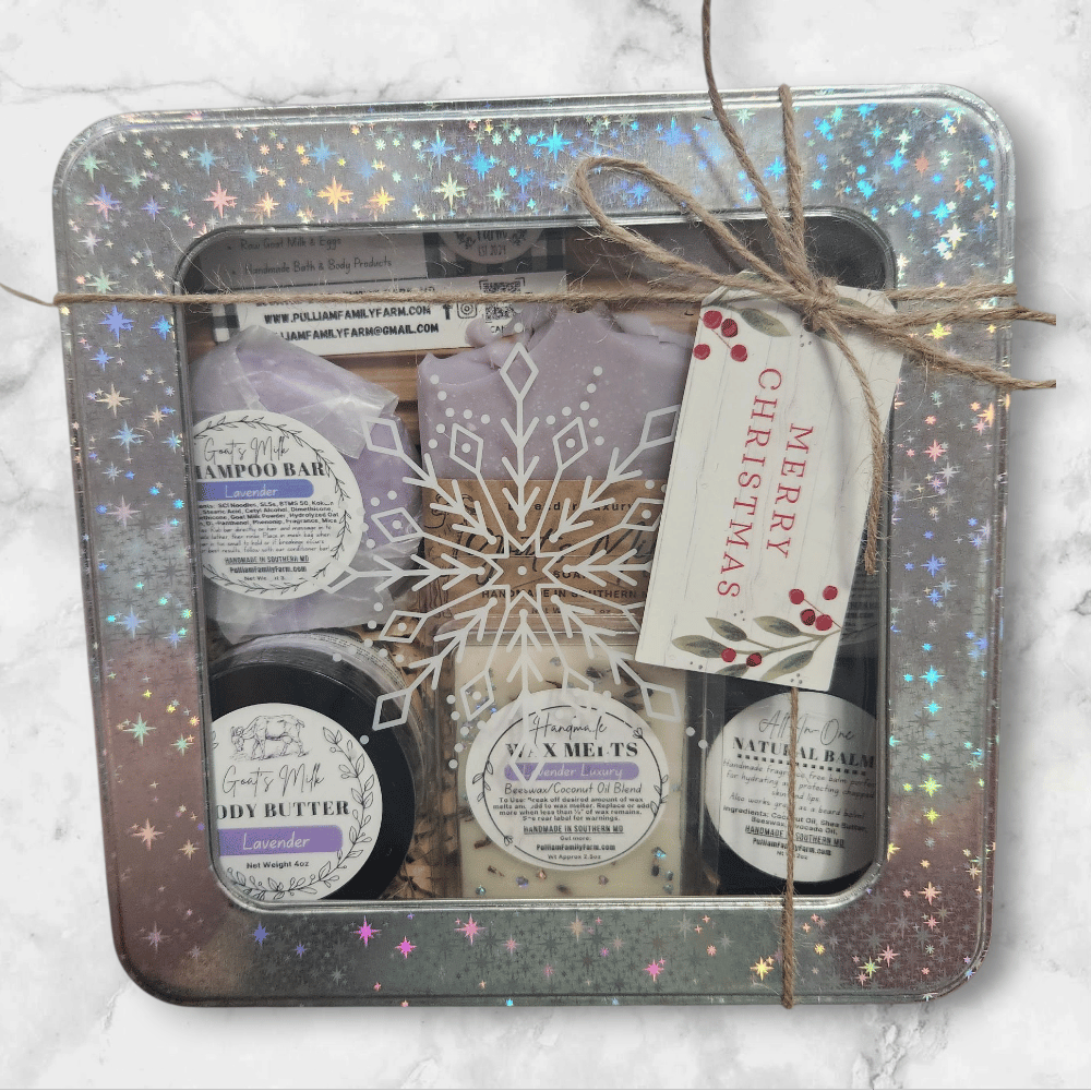 Get one soap bar, one jar of body butter, a shampoo/conditioner bar set, our all-in-one natural balm, a wax melt, and an 8" long USA made wooden soap tray! All ready to give or wrap in a reusable winter themed tin. This gift set full of items can last up to TWO months depending on use. These are perfect as gifts for friends and family to share all of our most loved products with!Β